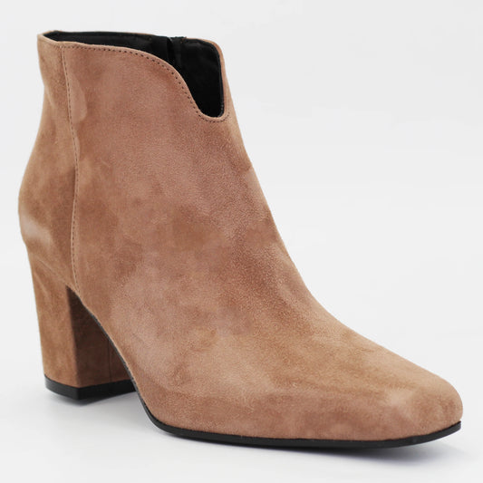 Women's heeled ankle boot with square toe in calf leather suede taupe (roses4)