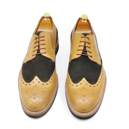 Men's Derby Brogue in Calf Leather Brandy Tan and Suede Forest Green - Ultra Light Rubber Sole (MER7365)